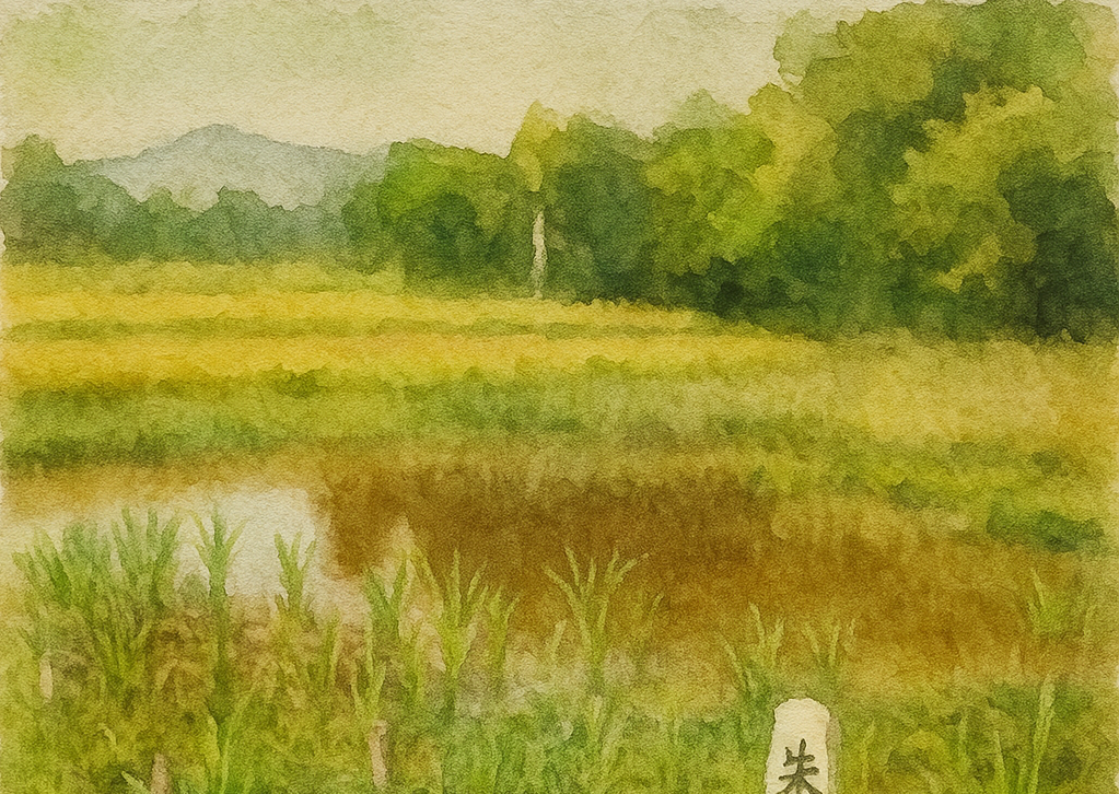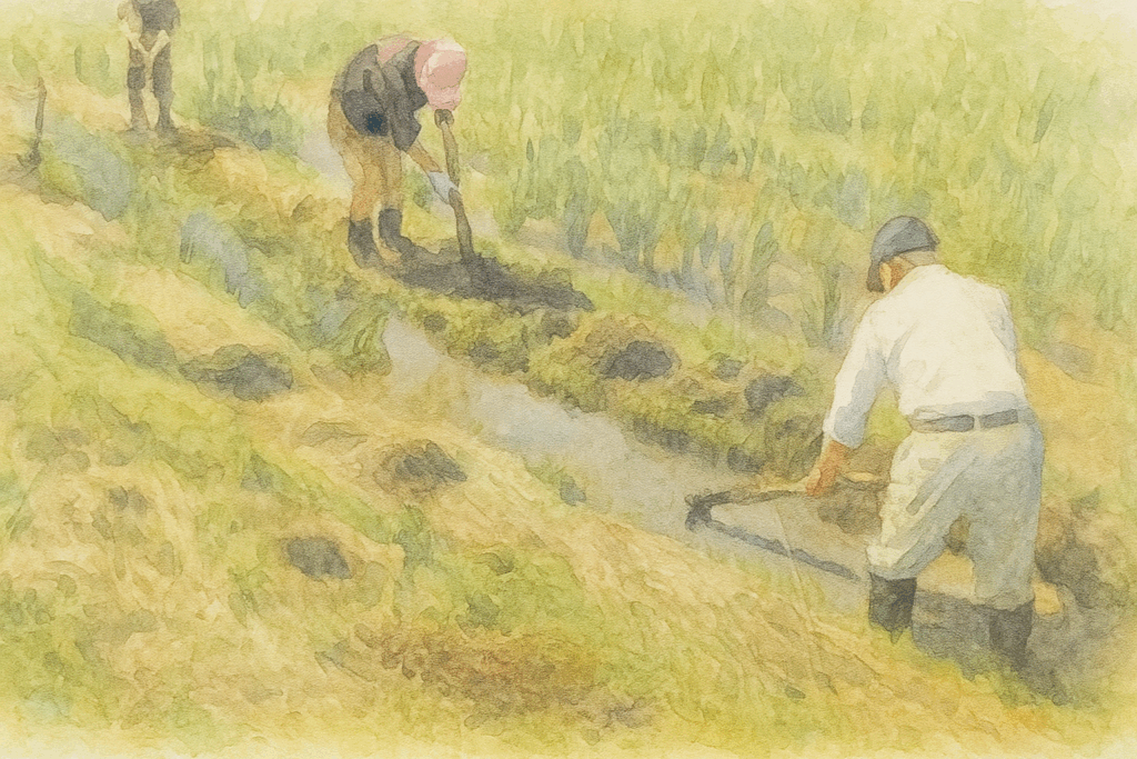 他地域の田んぼの畔は除草剤などを使って枯れた雑草の黄色が際立ちますが、除草剤を使わない佐渡の田んぼの畔は、草刈りがされ、緑色です。田んぼの畔で草刈りをしている光景が佐渡ではよく見られます。