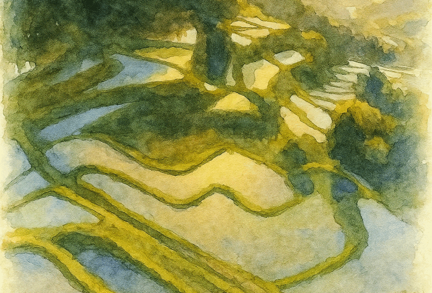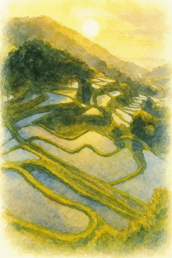 棚田、ため池、湧水、段丘の田んぼ、国仲平野。